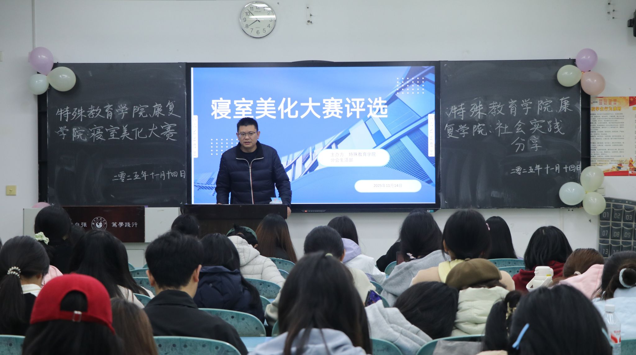 本网讯(文/代蓉洁 图/薛菲)11月14日晚,特殊教育学院举办的“悟二十大精神,扬公寓之风采”寝室美化大赛在行知楼210教室圆满落幕。活动特邀分团委书记朱以荣、分会副主席高婷、分团委副书记赵芳、易班站长陈锦、青年传媒中心主任钟欣利担任评委,2025级新生共八个寝室参与比拼。