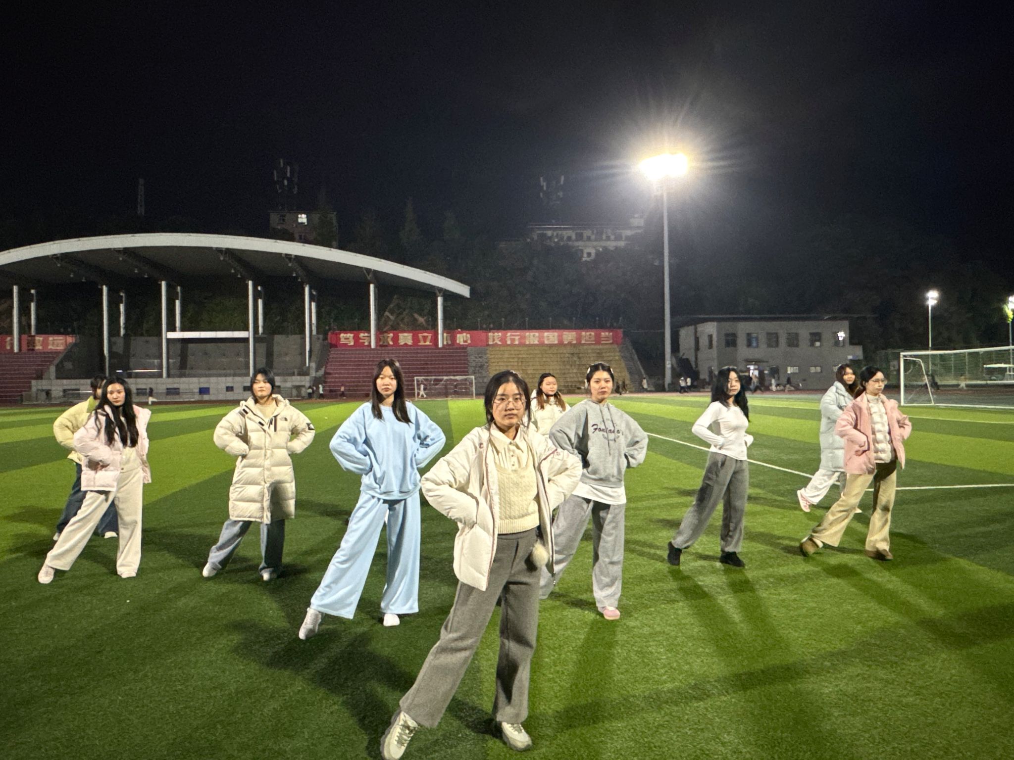 在教学过程中,针对部分学生动作衔接不畅、队形变换不熟练等问题,指导教师耐心引导、逐一突破,并灵活调整舞蹈编排——简化复杂技巧、强化节奏适配,使舞蹈在保持艺术观赏性的同时,更贴合学生的学习特点。同学们也在互助中共同成长:有人忘记动作时及时提醒,有人疲惫时彼此鼓励,真挚情谊在舞步间自然流淌,生动诠释了“像你这样的朋友”这一主题内涵。