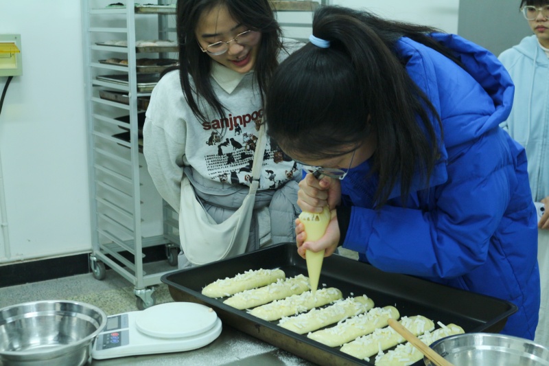 课堂即舞台,食材即素材。在专业烘焙师的耐心指导下,同学们逐步领悟到烘焙不仅是一门手艺,更是一场调动多感官的审美旅程。从奶油色调的调配、饼干造型的构思,到水果与蛋糕的整体布局,每一步都是对色彩学、造型艺术与质感的生动实践。同学们专注投入,以手为媒,以心为感,将自我表达与艺术想象融入食材之中,让普通的面团、奶油与果饰化身为承载情感与个性的艺术作品。