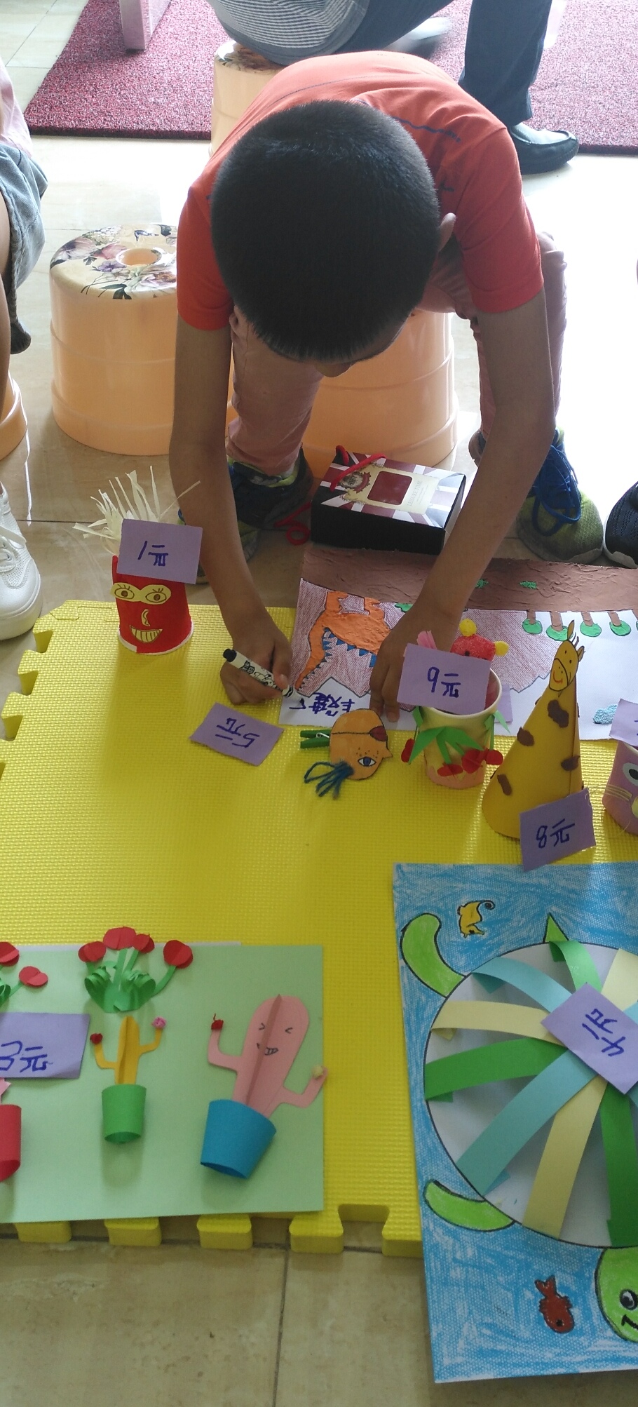 下午一点五十,家长带领儿童准时在一楼大厅集合,然后在小老师和家长的协助和辅导下,设计摊位名字和招牌,对自己的旧物品定价并摆摊销售。