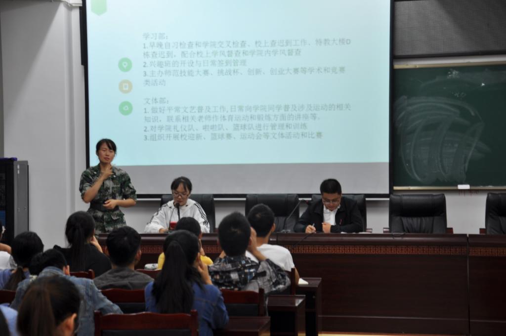 大会第二项,由分团委书记朱志刚,辅导员李红、李晓畅、周丽岚对团学工作及学生干部队伍建设发表看法。朱志刚谈到,我们应该细心做好每一件“小事”,“大我”的成就是日常小事的凝聚。生活中充满了各种挑战,同学们应该直面挑战,只有不断地挑战自我,才能让自己更加优秀。他还对各学生组织负责人以及学生干部做出了鼓励,希望在新学期里大家一起奋斗、一起收获、一起成长。李红表示,虽然大家的日常工作很辛苦,但是能从中得到能力提升,希望各负责人以及班干部继续努力工作。李晓畅则重点向大家介绍了迎新工作的大致部署,希望大家一起做好迎新工作。最后,周丽岚从就业的角度讲解了学生干部应具备的能力要求,并且解读了国庆放假安排及安全事项。