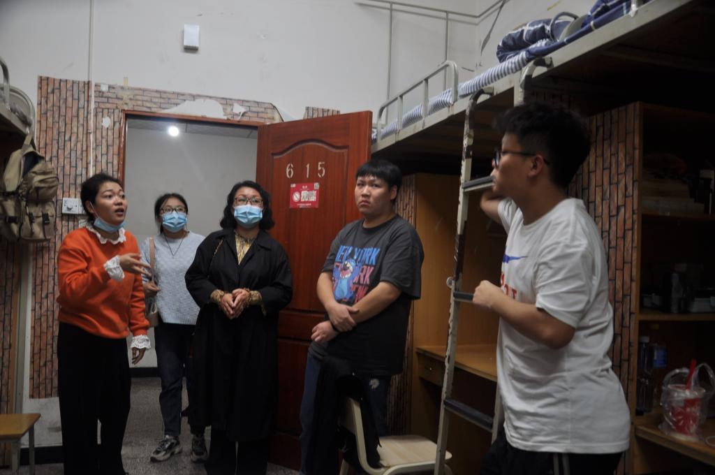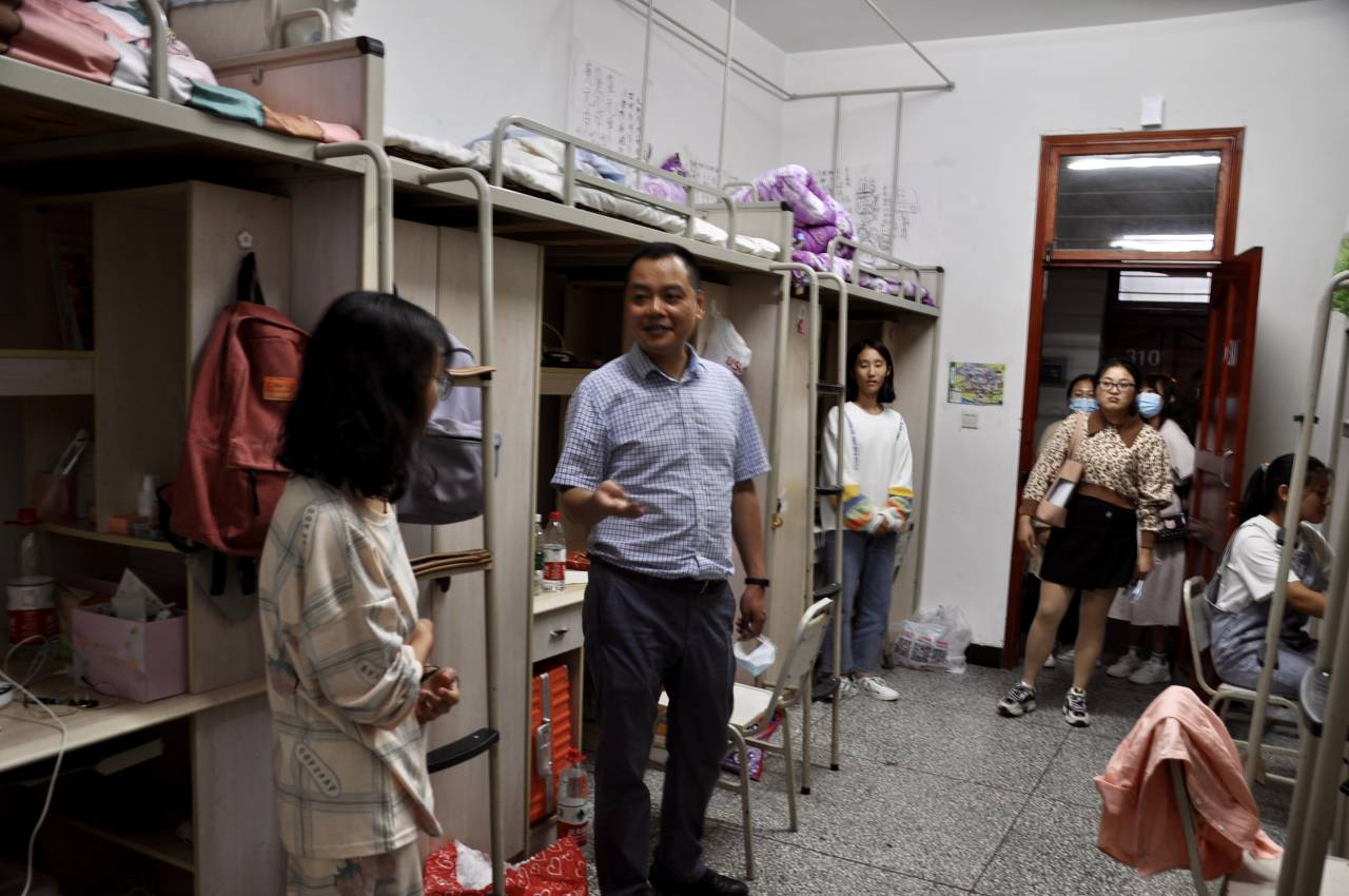 学院领导和老师们分为两组来到特教学院各学生宿舍,一组由刘宗泉带队走访了百一、百二、百五及百八宿舍楼的新生;另一组由张梅和兰芳带队,走访了桂苑、学九、学三以及学十宿舍楼的新生。院领导和老师们亲切地询问同学们到校后的情况,比如到校是否习惯,有无需要帮助的地方等。同时,因为还处在疫情防控的时期,院领导提醒同学们在学校要带好口罩,保护好自己。刘宗泉还嘱咐新生们,在大学期间要学会互帮互助,团结友爱。张梅提示同学们要注意网上诈骗,保管好自己的财务,遇到问题要多询问辅导员老师。兰芳则希望同学们在大学期间,除了要学好专业知识,也要多多参与集体活动,才可以更快更好地适应大学生活。最后,新生们表示到校第一天便能感受到学院对同学们的关怀,这使他们分外感动,也对领导们的来访表示感谢。
