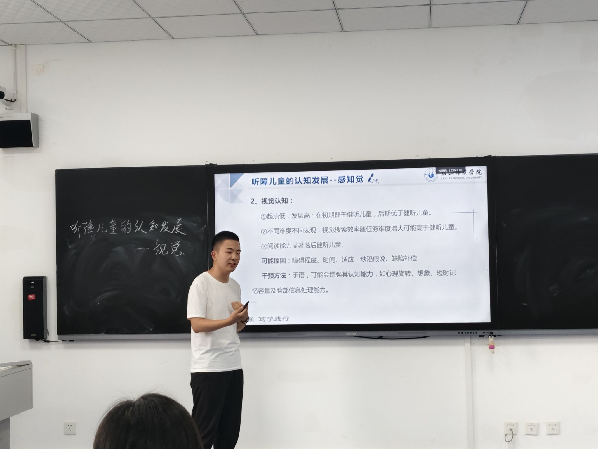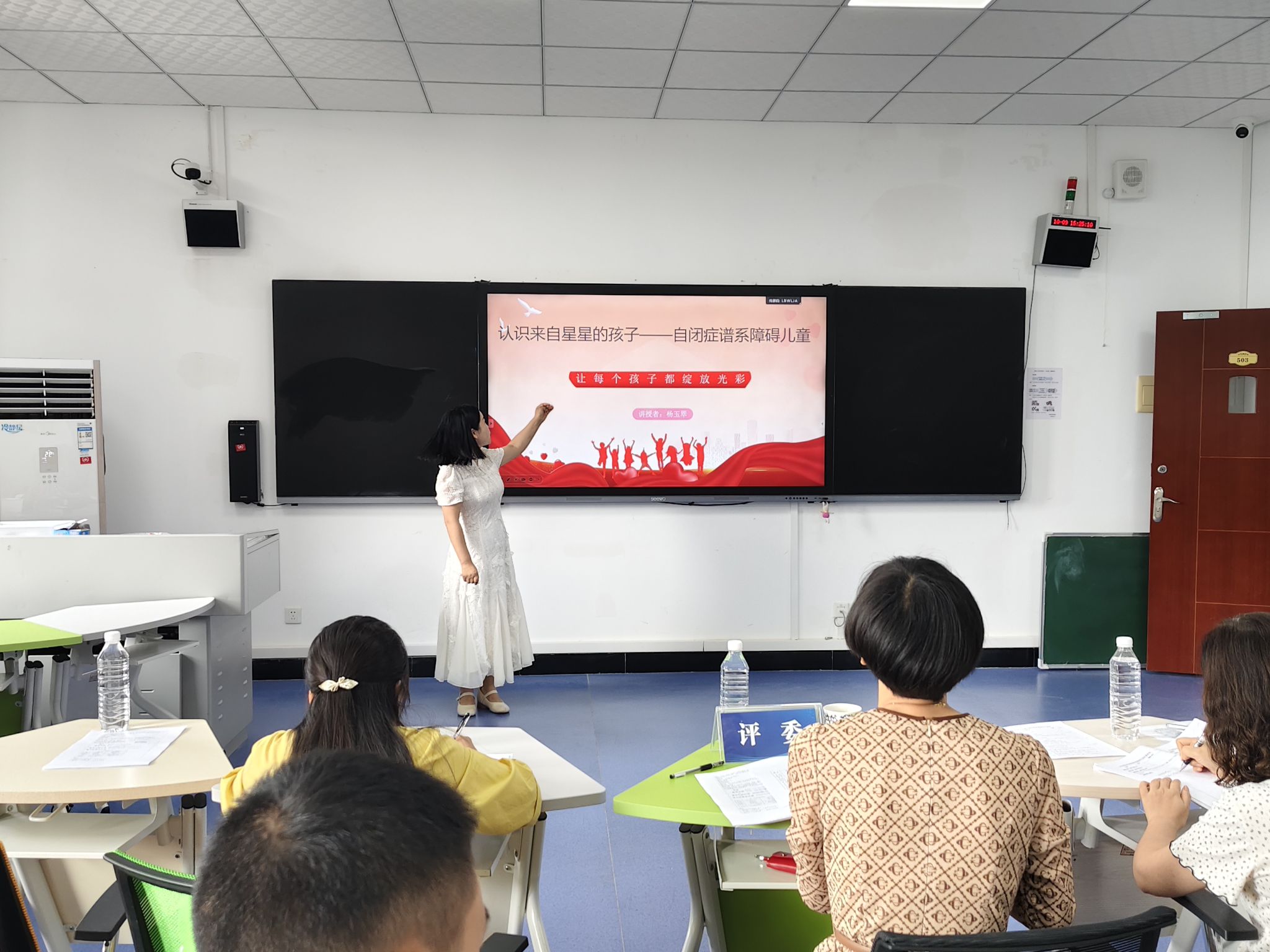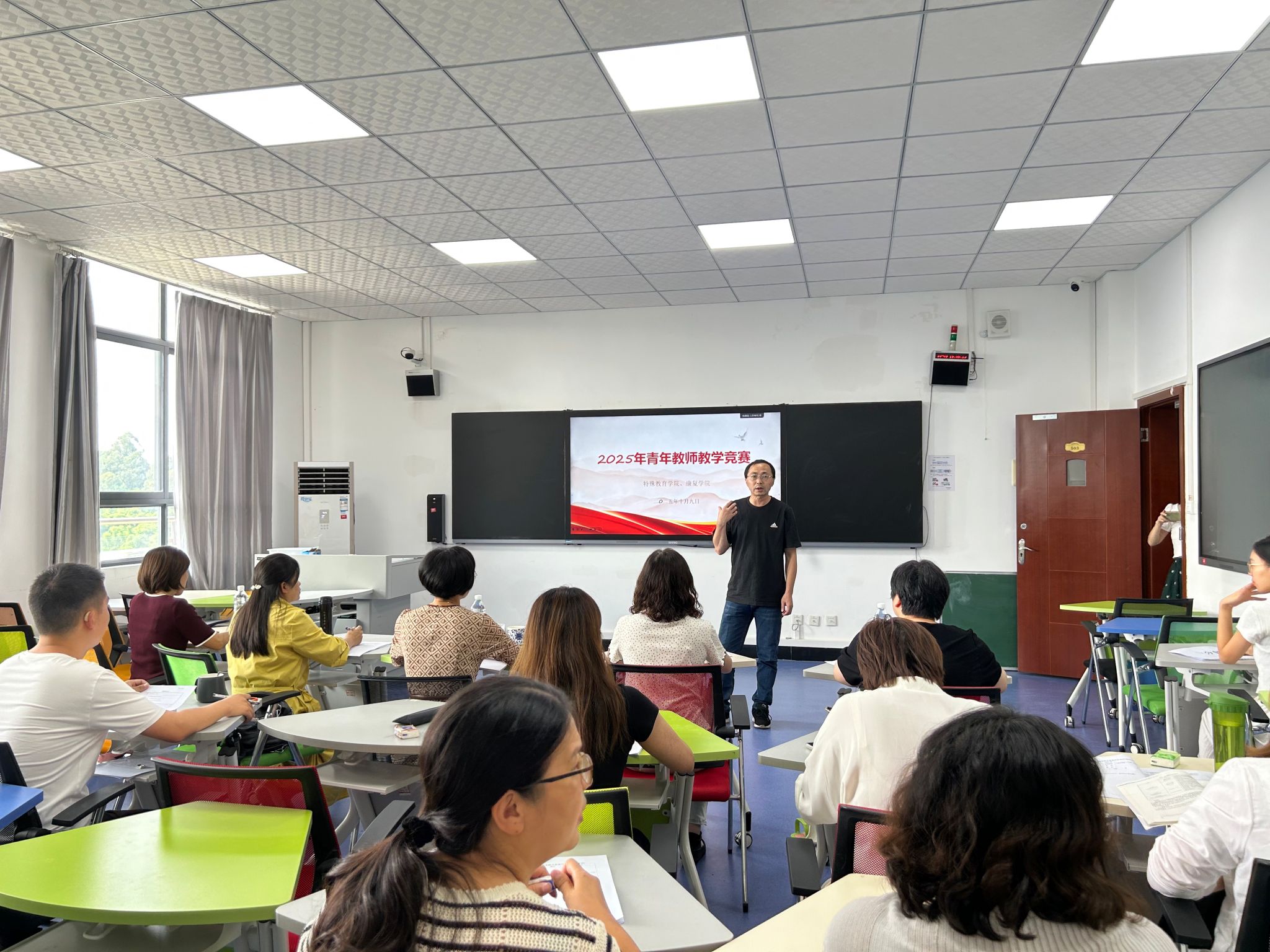 本网讯(文/图 王欢)2025年10月9日下午,特殊教育学院2025年青年教师讲课比赛暨特殊教育系教学研讨活动在学院A栋503教室顺序举行,9名特殊教育专业青年教师同台竞技,以十分钟微课展示教学风采。